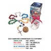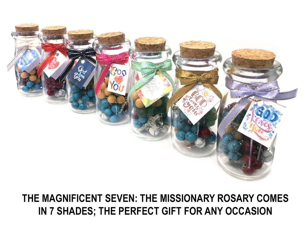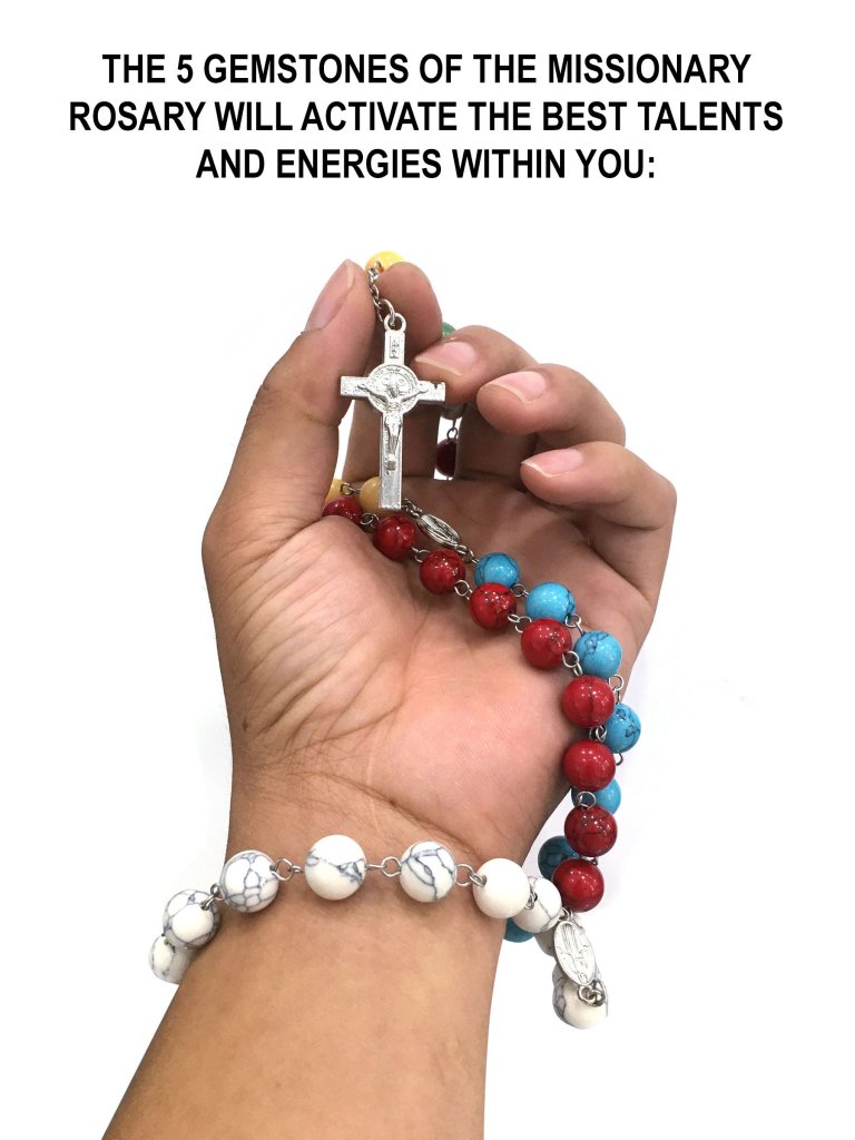 The Missionary Rosary is composed of gemstones of Five Colors, representing the Five Continents: GREEN JADE for Africa; RED CORAL for The Americas; WHITE HOWLITE for Europe; BLUE TURQUOISE for Oceania; and YELLOW JASPER for Asia.