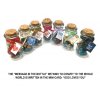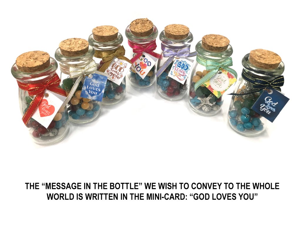 It is contained in a transparent bottle, sealed by a cork; wrapped with a ribbon, and displaying a mini-card with the phrase: “God Loves You”.